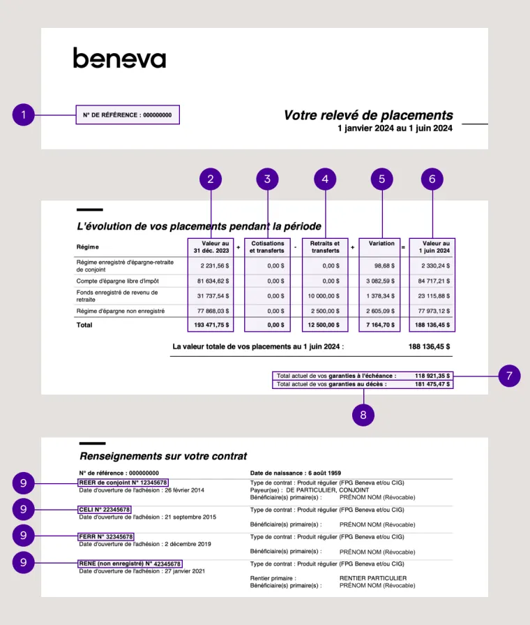 3. Cotisations et transferts : c’est le total des montants que vous avez investis durant la période du relevé de placements.
