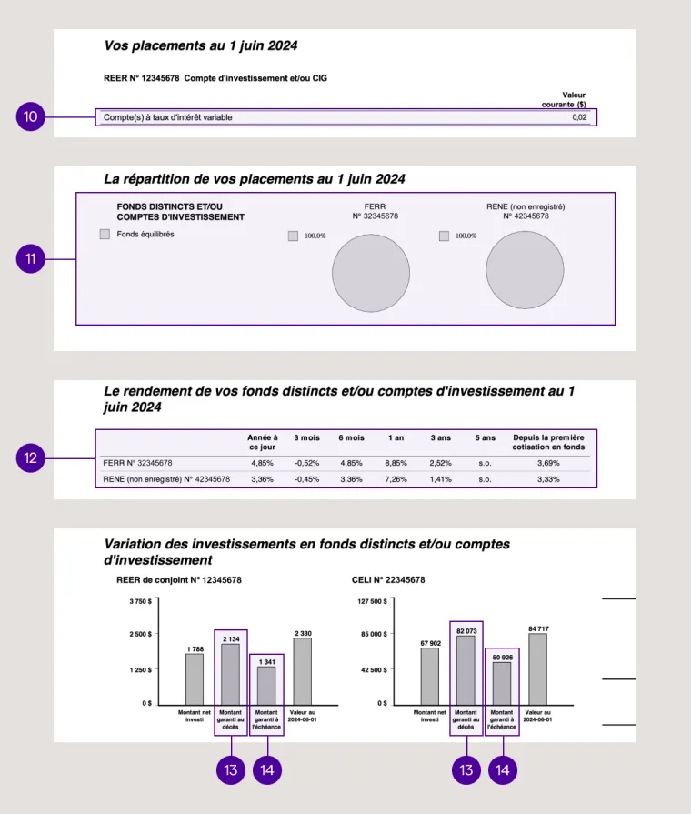 Cette section vous permet de comparer, pour chacun de vos régimes, la valeur de vos placements avec le montant total que vous avez investi, ainsi que les montants garantis en cas de décès et à l’échéance de la garantie.