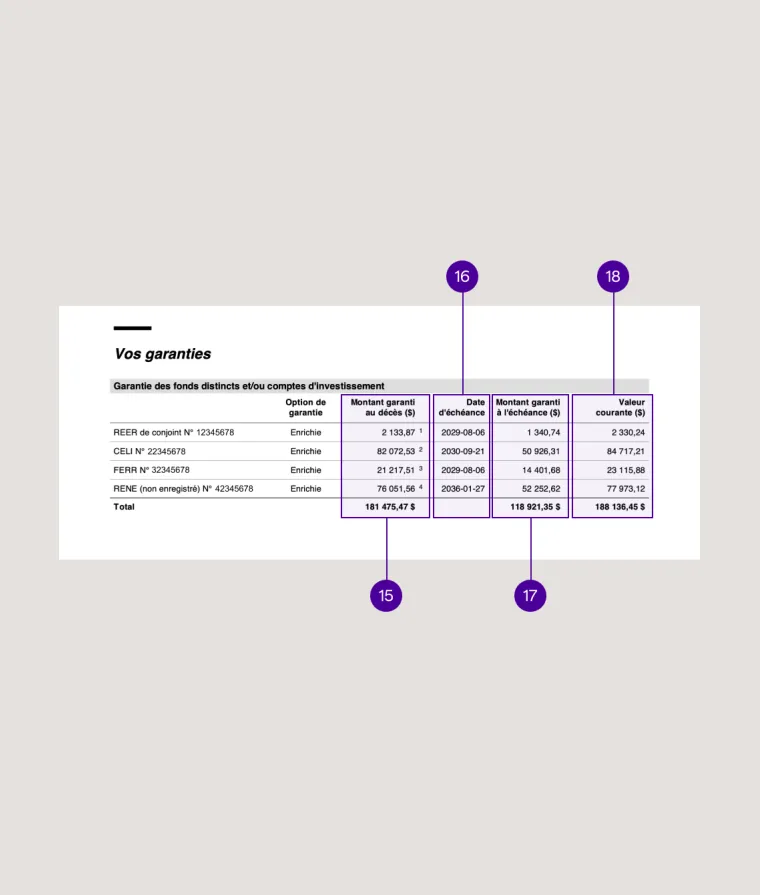 17. Montant garanti à l’échéance : c'est la valeur de vos placements qui est protégée par la garantie à la fin de votre contrat.
