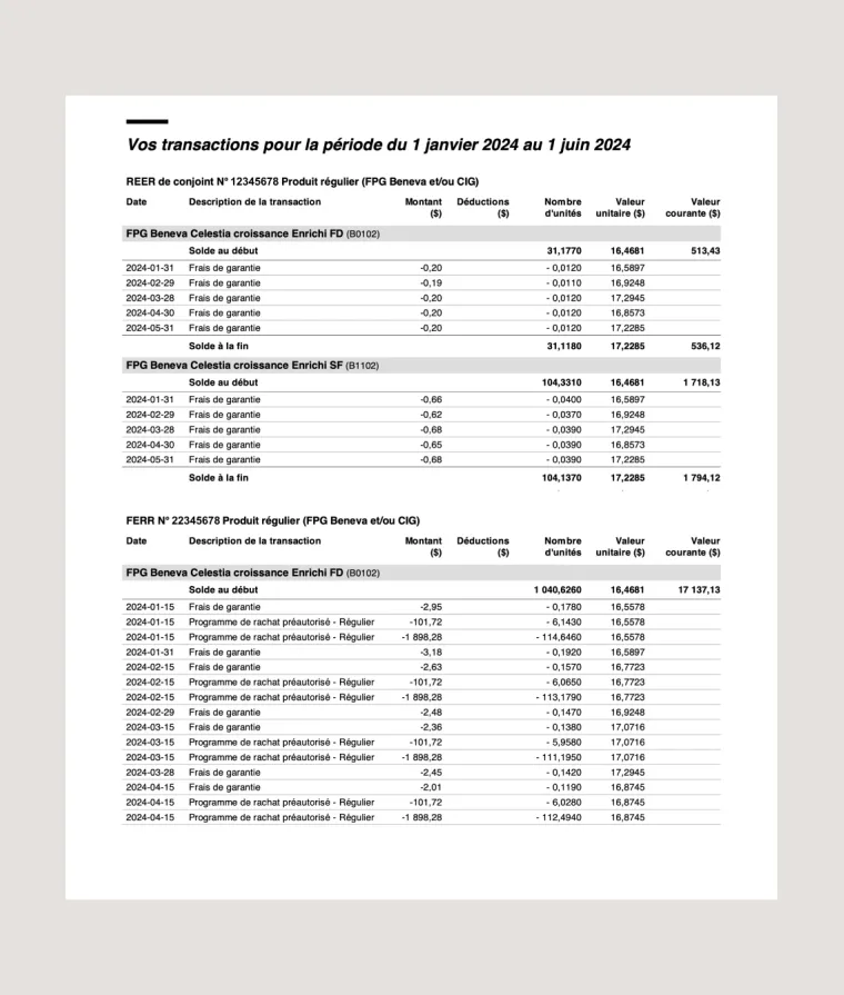 Chaque année, vous recevez deux relevés de placements : le relevé de mi-année et le relevé annuel. Ils contiennent les mêmes informations, mais pour des périodes différentes (du 1er janvier au 30 juin et du 1er janvier au 31 décembre).